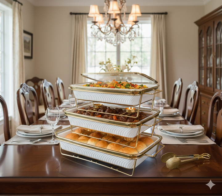 warming Mechanism: The middle and bottom units show small gold-toned cups nestled within their frames, which are designed to hold tea light candles or chafing fuel gel to provide the heat necessary for warming the food pans above them. The top unit rests on its own lid or a separate heating platform (the image is slightly ambiguous here, but the principle remains the same).