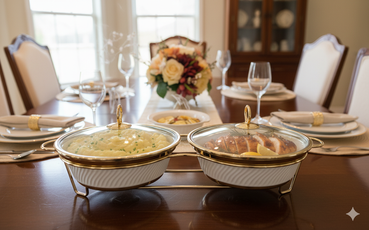 Serving hot food: Keeping dishes like curries, casseroles, dips, mashed potatoes, vegetables, or small quantities of a main dish warm for a dinner party or holiday meal.