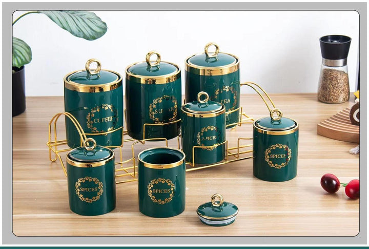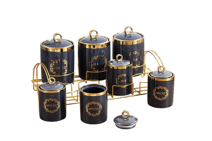 Luxury Ceramic Spice Storage Jars 7-Piece Set With Golden Stan