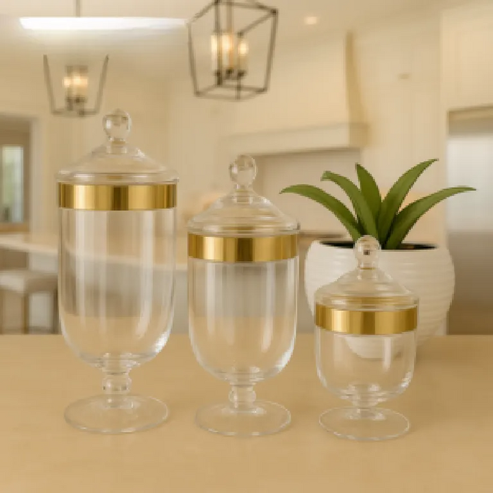 These are clear acrylic jars, often available in sets of three, featuring a golden band or trim around the lid area for a luxurious aesthetic. They often come with airtight lids to help keep contents fresh.
