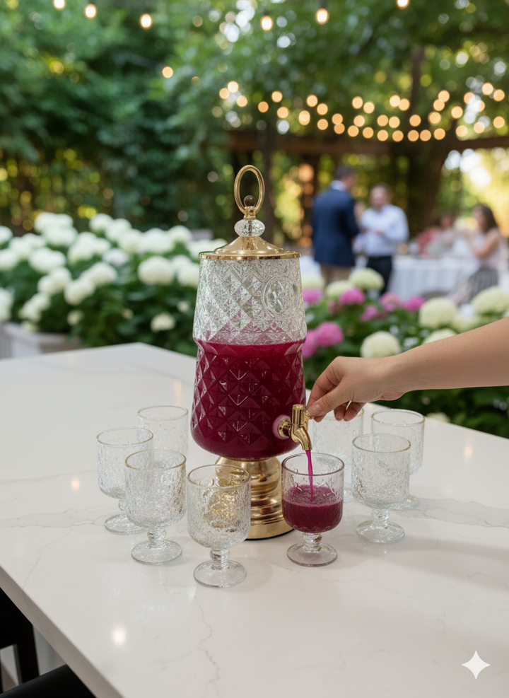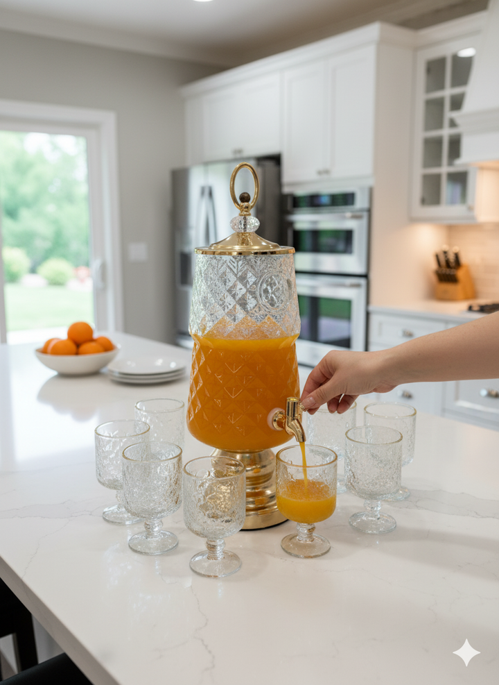 Intricate Design: The main dispenser has a striking, tall, cylindrical shape. Its body is made of clear, textured glass or crystal with a detailed diamond-cut or criss-cross pattern, which will beautifully refract light and the color of the liquid inside.
