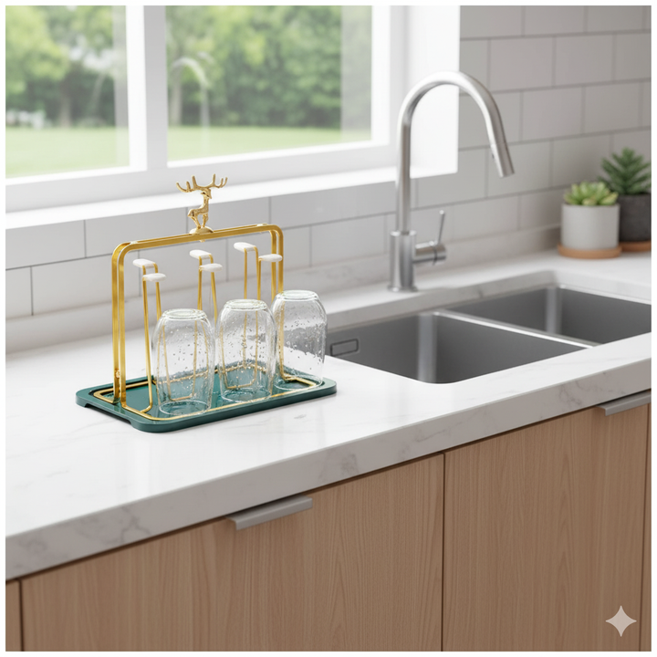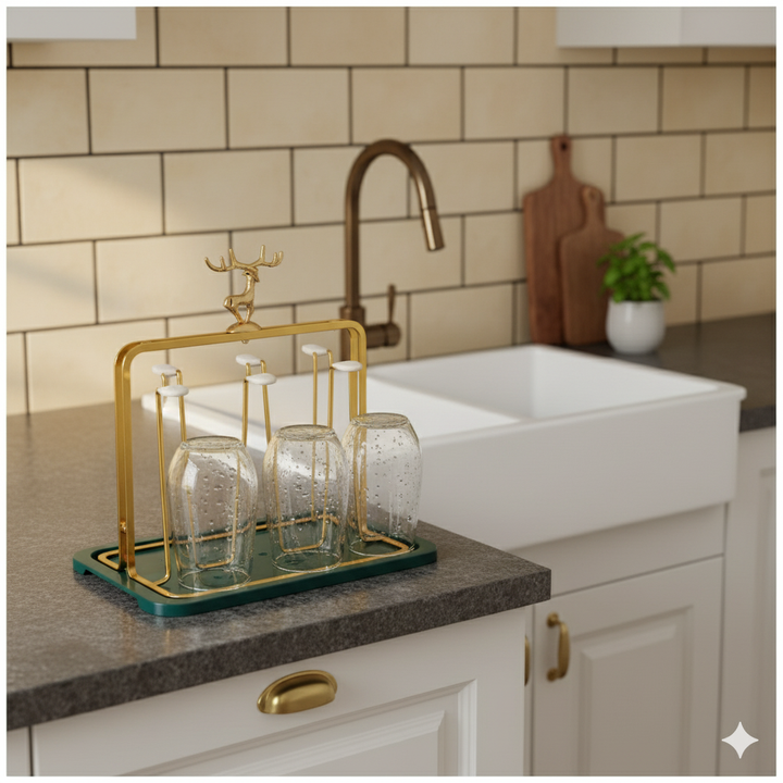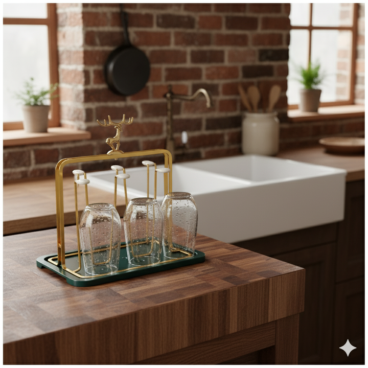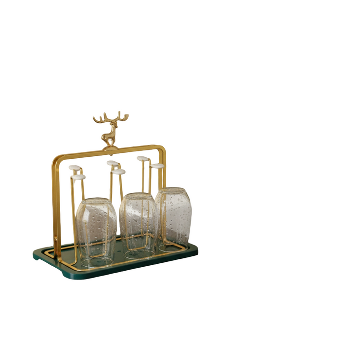 Luxury Golden Glass Cup Holder Rack with Tray & Deer Handle