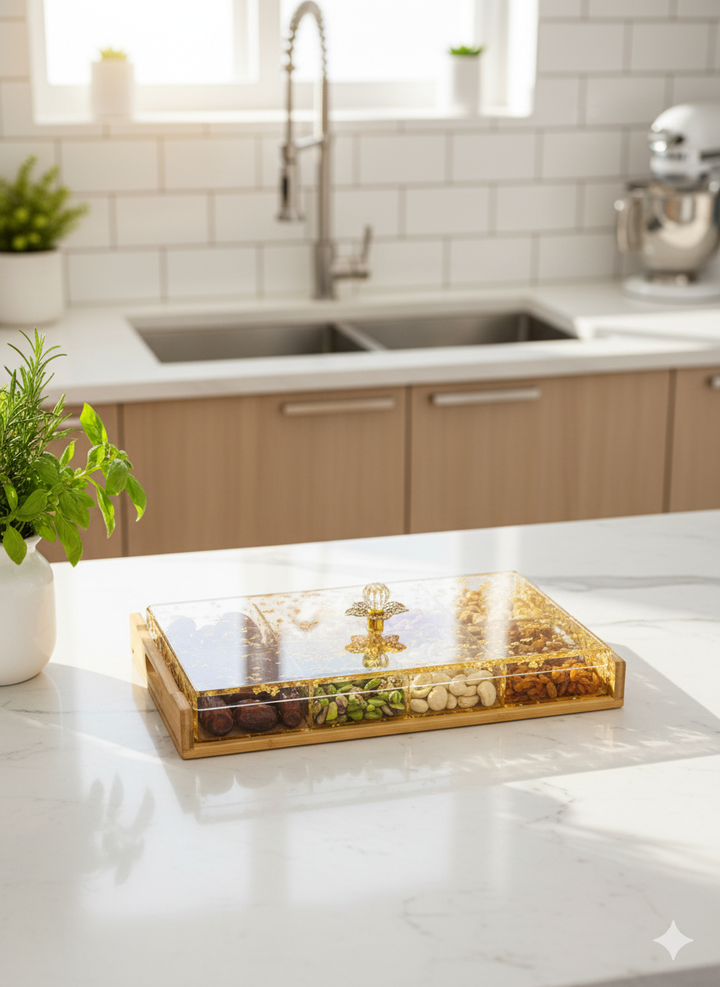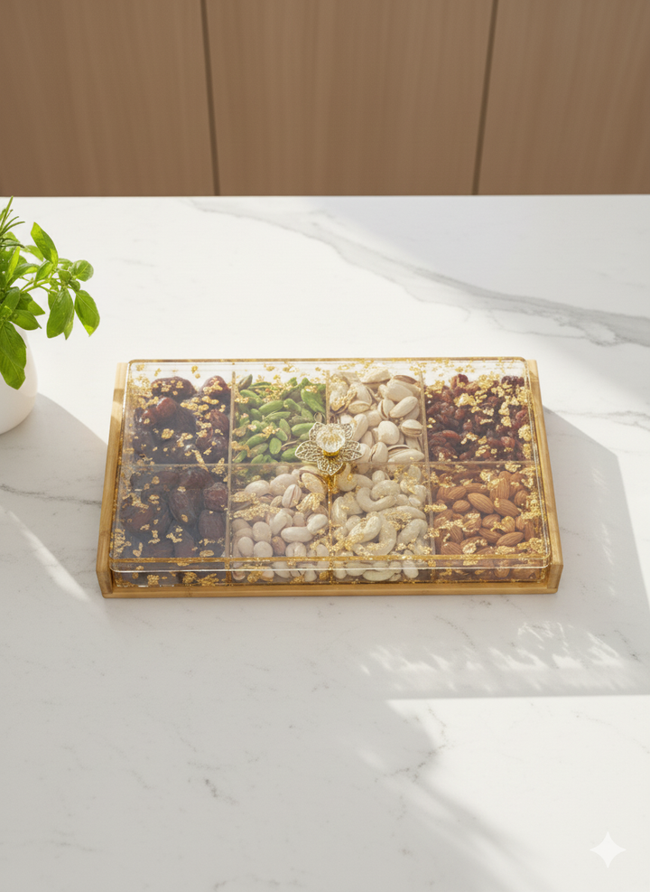 Sectioned Compartments: The interior is divided into multiple square sections, allowing you to beautifully organize and separate different types of dry fruits, such as pistachios, almonds, cashews, raisins, or dates, keeping their flavors and textures distinct.