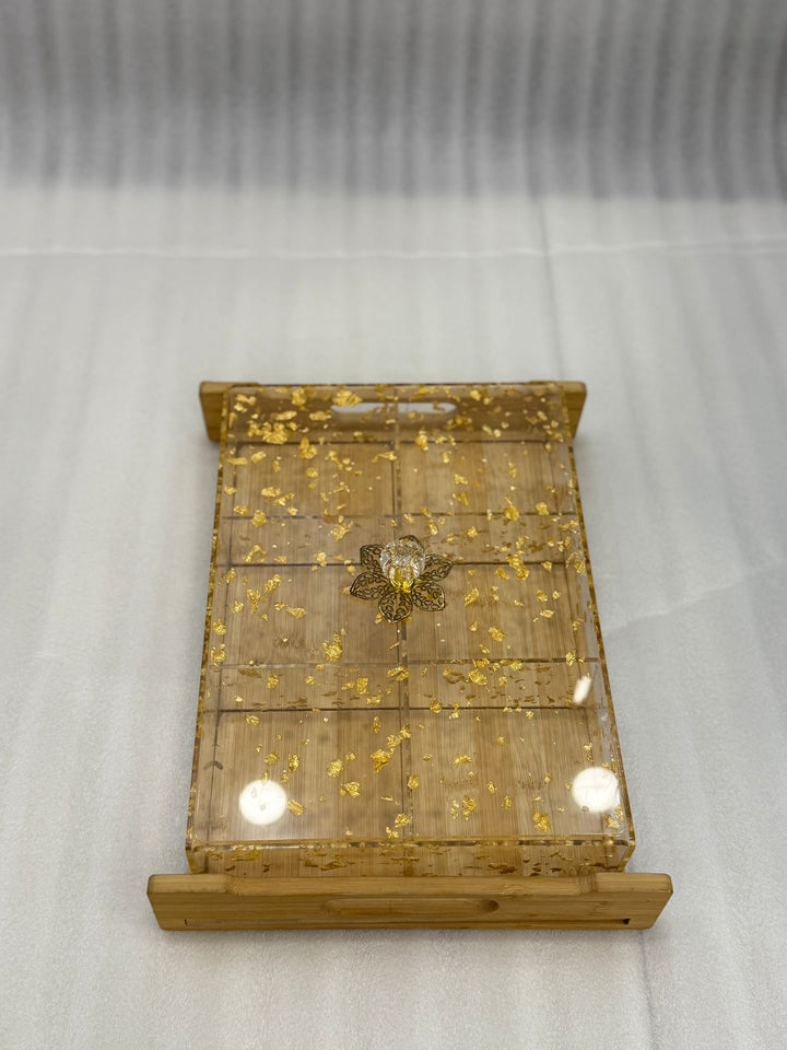 Decorative Handle: The central, flower-shaped crystal or acrylic knob provides an easy and elegant way to lift the lid (if it's a box) or move the entire tray while serving.