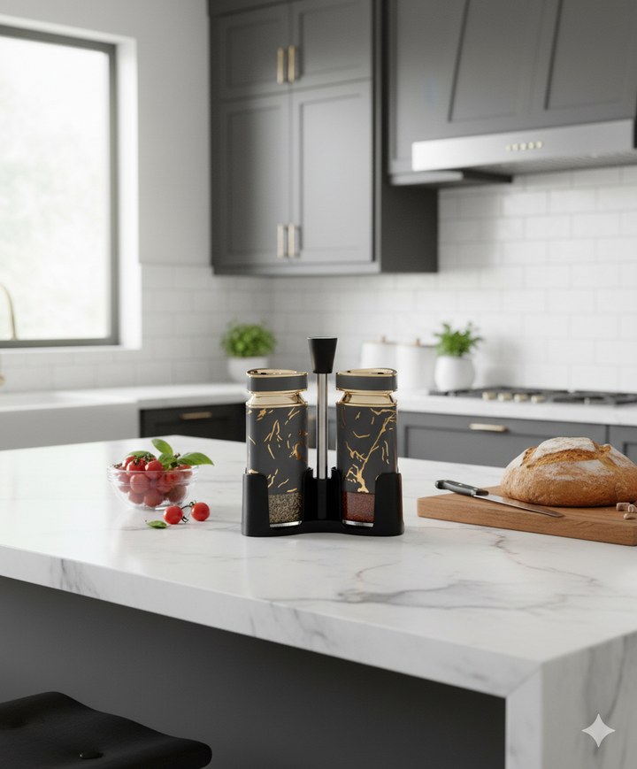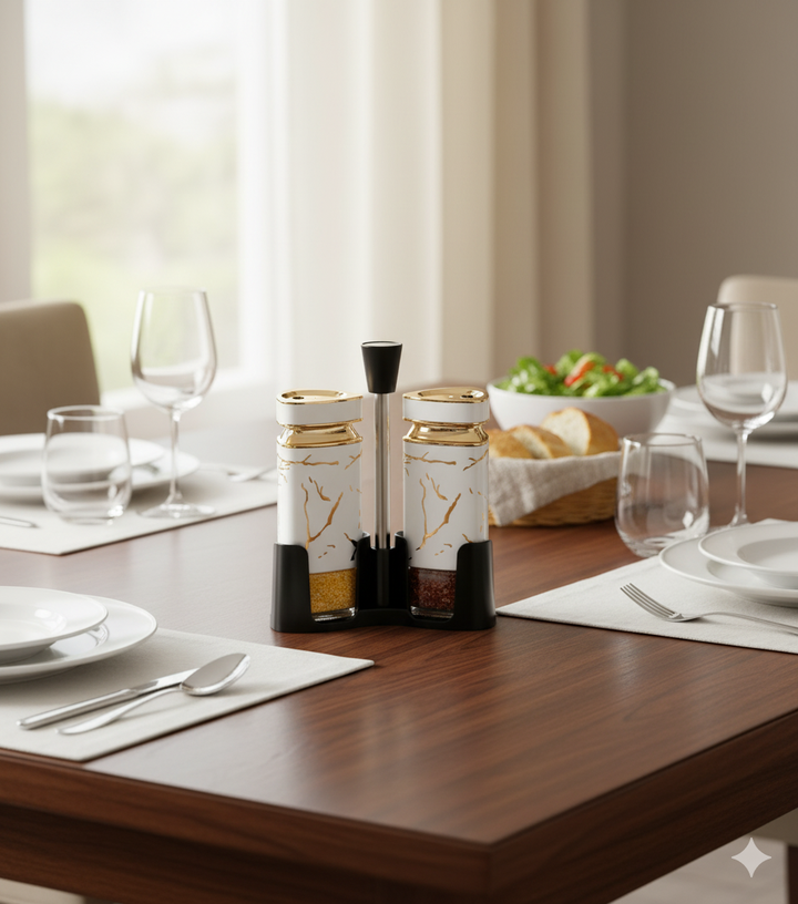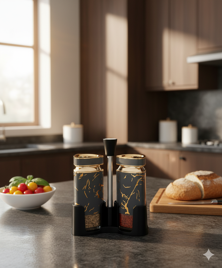 A notable feature is the clear visibility of the contents at the bottom of the shakers. This makes it very easy to identify the spice inside and monitor the refill level without needing to open the lid or rely solely on a label. The carrying handle also stands out, making the set highly portable and practical for serving.