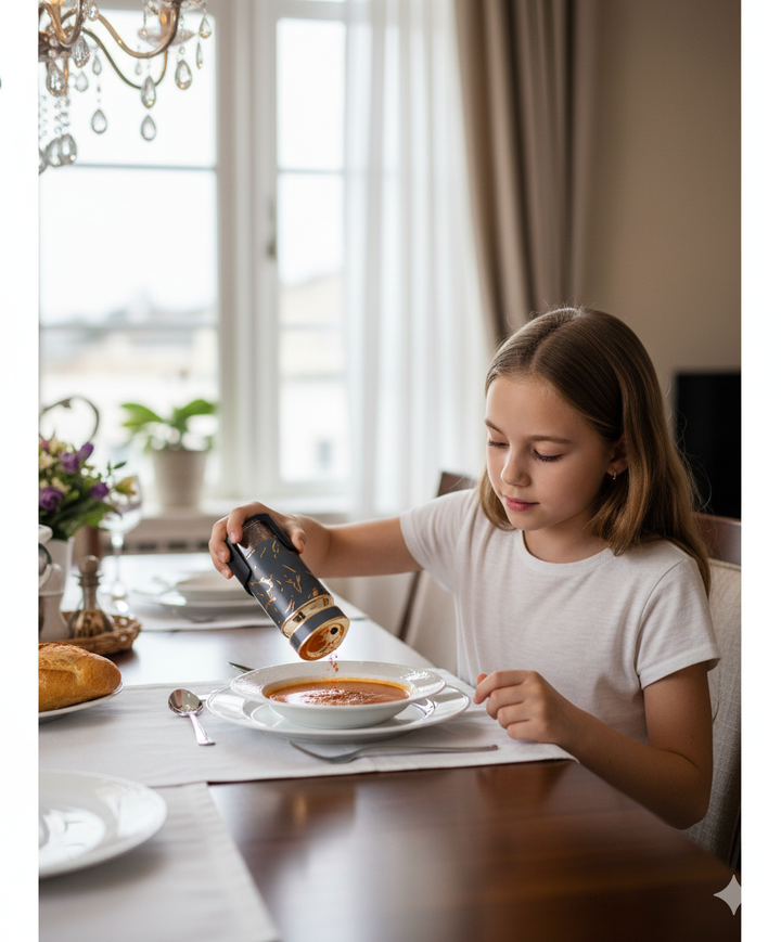 Shaker Body: Likely glass or a high-quality acrylic/plastic for the see-through bottom portion, with the patterned black/gold coating applied to the rest of the body.