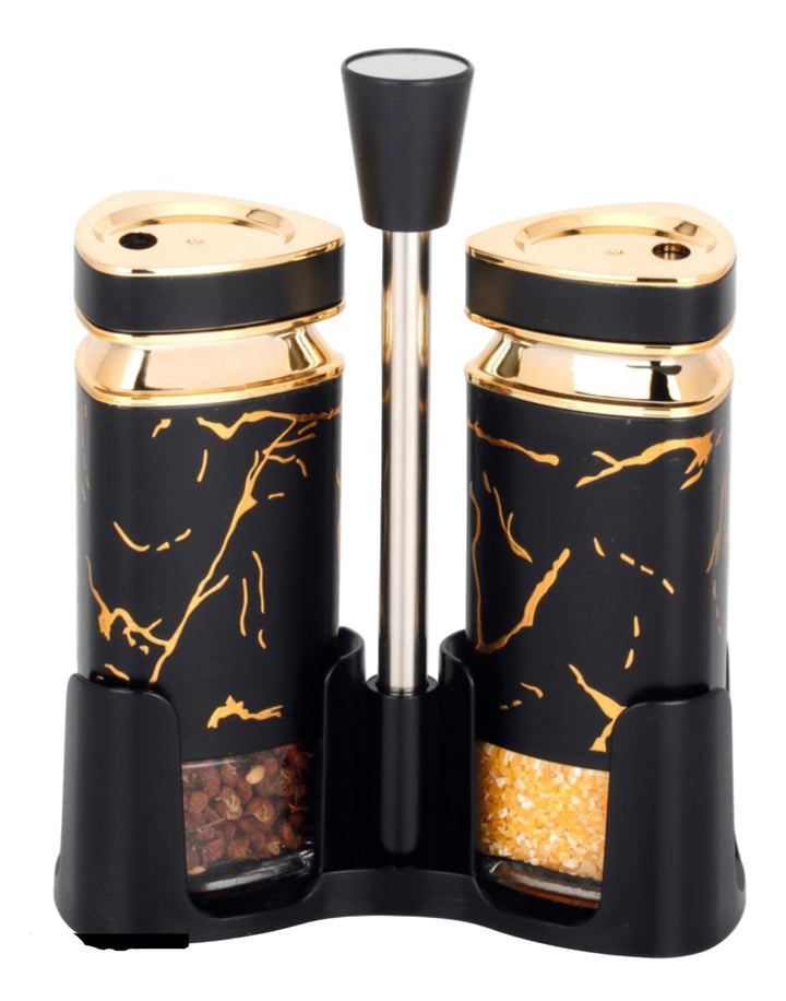 This set features two cylindrical shakers with a distinctly modern and luxurious design. The main body of each shaker is a deep black with an eye-catching gold marble or vein pattern running across it. The lids have a matching metallic gold finish and feature a spout or opening for dispensing the contents.