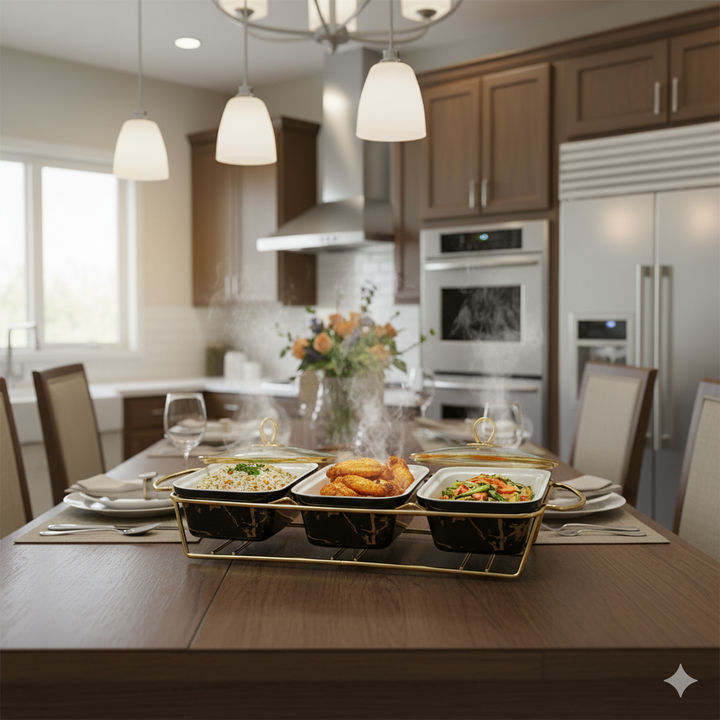 Serving Dishes: The three containers appear to be made of ceramic or porcelain, which is excellent for serving food and maintaining temperature. They feature a decorative dark (possibly black or deep green) finish with gold-tone marbling or veining.