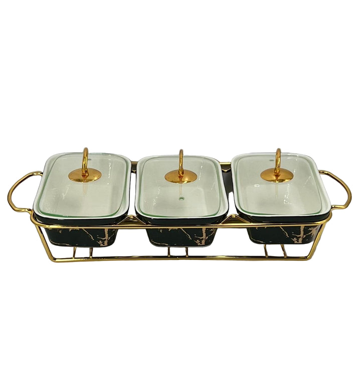 This is a stylish triple serving dish set featuring three individual rectangular containers housed within a decorative metal stand. The set is designed for serving multiple appetizers, side dishes, or condiments simultaneously, making it ideal for parties, buffets, or family gatherings. Its main purpose is to display food elegantly and often, to keep food warm when a heat source (like a tea light or small burner, though not explicitly shown) is placed underneath the stand.