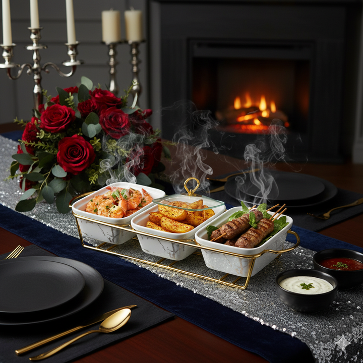 This is an elegant and practical three-section serving dish set, perfect for entertaining and presenting appetizers, side dishes, or condiments with style. The set features three individual rectangular ceramic dishes nestled in a striking gold-toned metal stand.