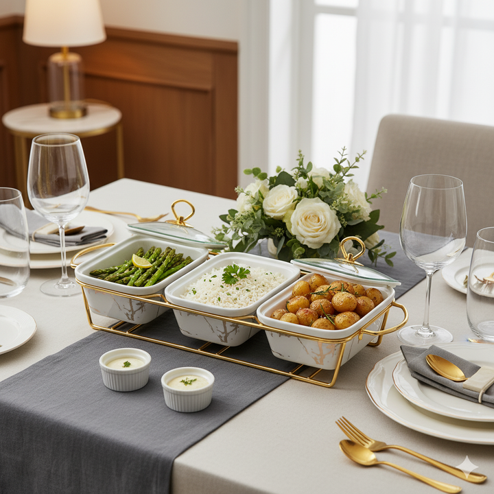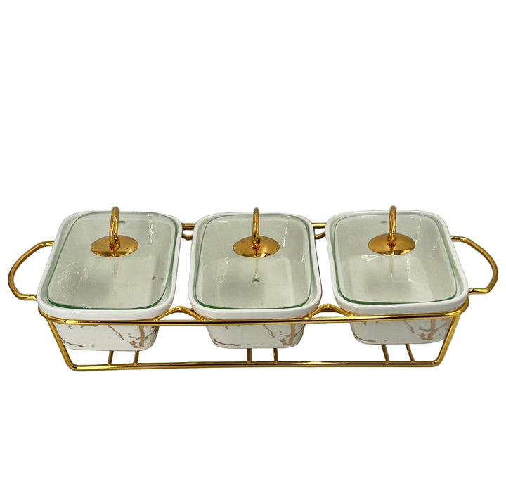 The ceramic dishes have a chic white finish with subtle gold marbling or detailing, giving them a luxurious, modern look. Each dish comes with its own lid, which has a clear top and a decorative gold loop handle for easy lifting. The gold metal frame securely holds the three dishes in a row and includes extended side handles for safe and easy transport from the kitchen to the dining table.