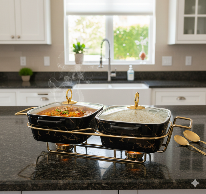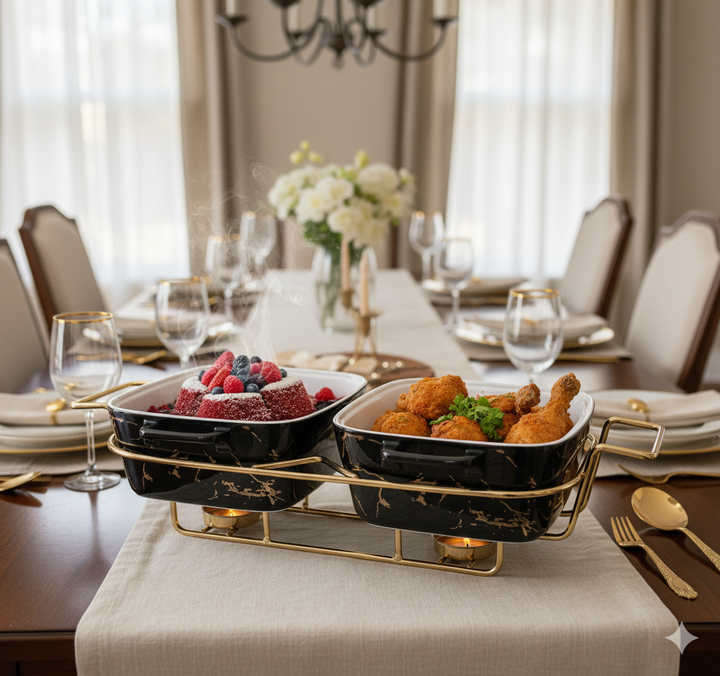 Serving Dishes: Likely made of ceramic or porcelain, known for their ability to retain heat and their elegant appearance. The black color with gold veining is a modern, high-end design finish.