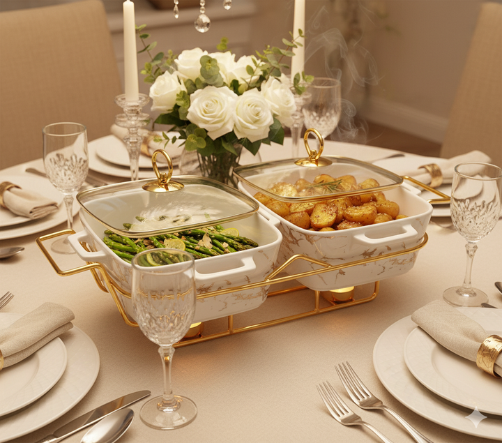 Aesthetic Appeal: The combination of white marbled ceramic and gold-toned metal and handles creates a luxurious and sophisticated look, suitable for formal occasions or holiday entertaining.