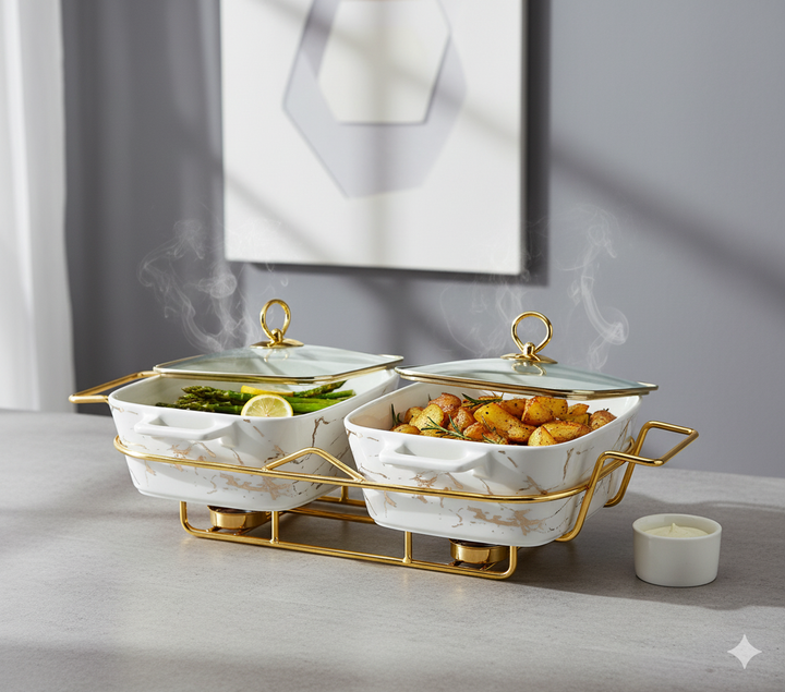 Elevated Serving: The metal stand elevates the dishes off the table surface, which can be useful for placing a heat source (like a small candle or fuel canister) underneath if the stand is designed as a traditional chafing dish (though no obvious fuel holders are visible, the general style suggests this possibility).