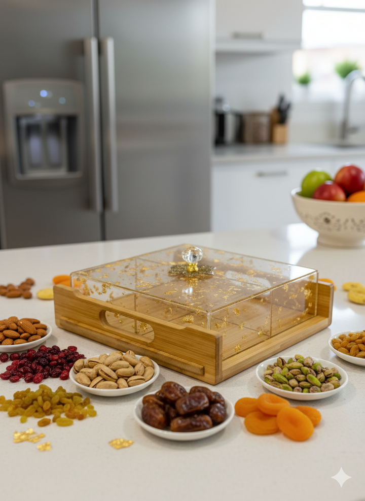 This is a luxurious and elegant dry fruits storage box, designed to both preserve and beautifully display its contents. The box features a clear acrylic lid that is richly embellished with decorative gold flakes, creating a sparkling and opulent effect. This acrylic cover is set on a base and frame constructed from natural light-colored bamboo wood.