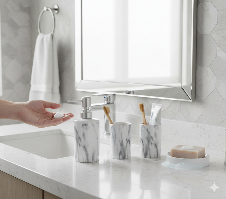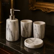 a four-piece bathroom accessory set with a white and gray marble-look finish. The set includes a soap dispenser (with a metallic pump), two tumblers or rinse cups, and a soap dish. These items are typically used to organize and enhance the aesthetic of a bathroom vanity or countertop.