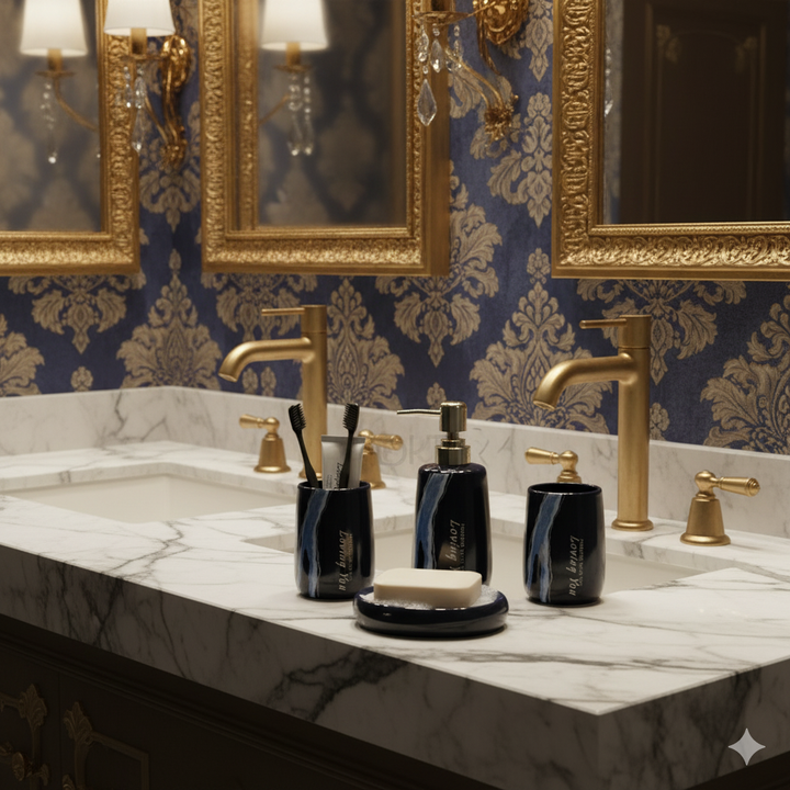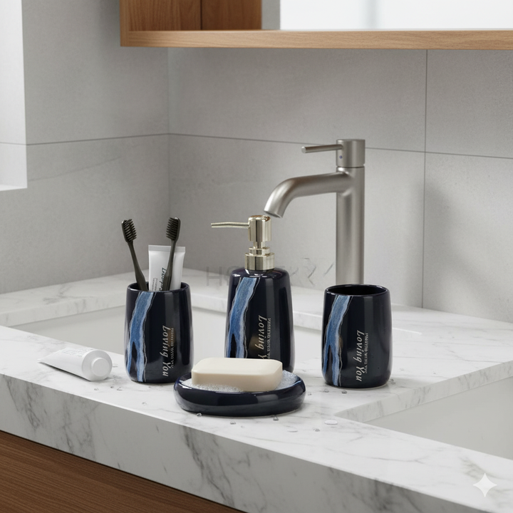 This is a stylish four-piece ceramic set designed for a bathroom countertop. The pieces are a deep, glossy dark blue or black with a swirl or streak pattern in a lighter, pale blue and white, resembling a wave, marble, or perhaps a cosmic design. Each piece appears to have the text "Loving You" inscribed on it, adding a romantic or sentimental touch.