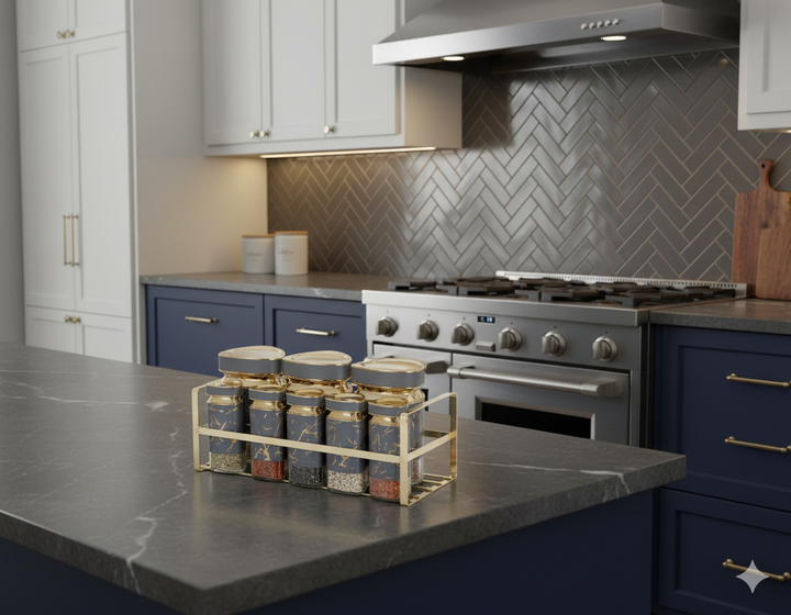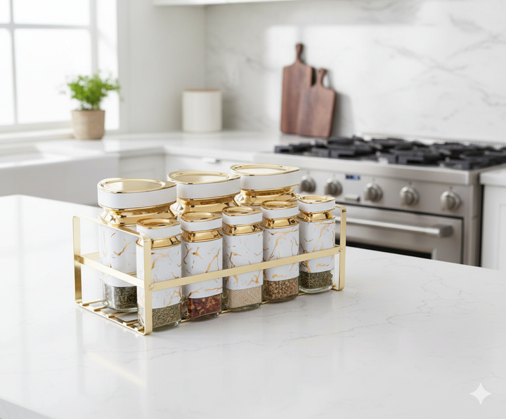Premium Elegant Marble 9-Piece Spice Set with Gold Rack