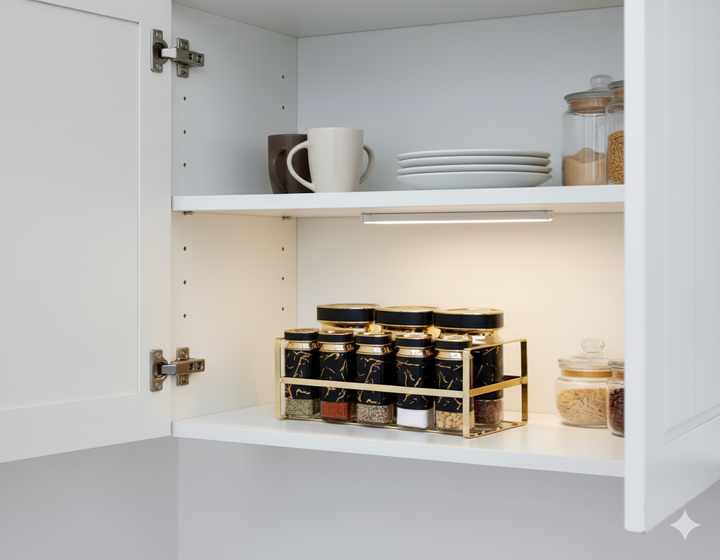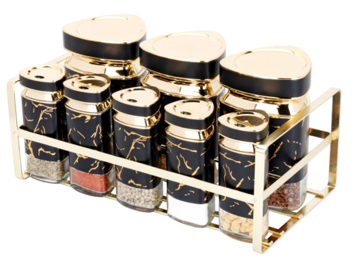 This set features nine containers total: six smaller rectangular spice shakers neatly held in a gold-tone wire rack, and three larger canisters with matching lids that sit on top of the rack. The overall aesthetic is luxurious and modern, utilizing a striking black and gold color scheme. The smaller shakers are filled with various spices and seeds, suggesting they are practical for daily cooking. The combination of the sleek black design with gold accents makes this a sophisticated counter-top or pantry organizer .