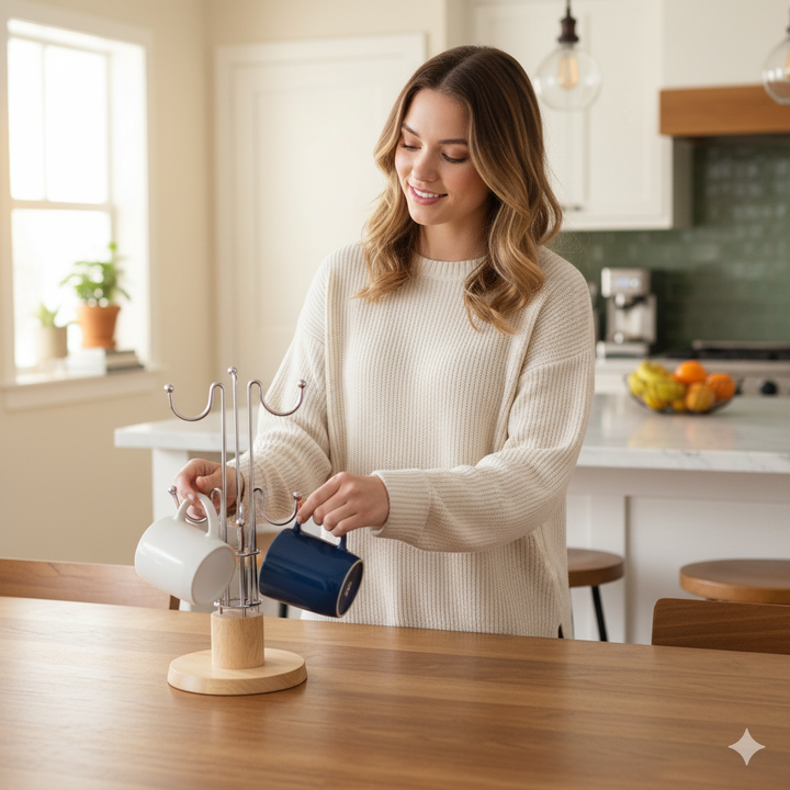 A standout feature is its four-arm, rotating design. This allows for multiple mugs (in this case, four are shown) to be hung securely while providing easy access to any mug without having to remove the others. The hooks at the end of each arm are slightly curved upward to ensure the mug handles stay in place. The overall design is sleek and space-efficient, making it suitable for both small and large kitchens.