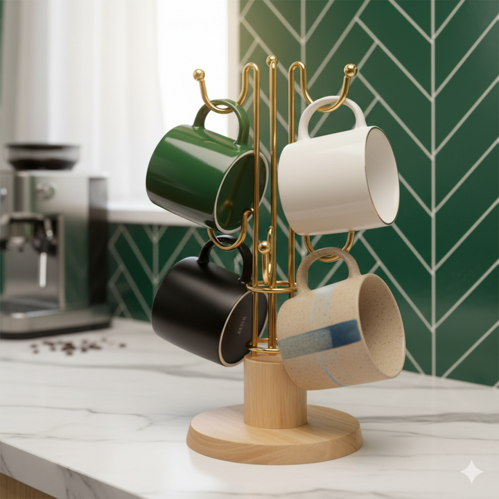 The object is a Mug Tree or Cup Holder Stand. It's a stylish, decorative, and functional kitchen accessory designed to organize and display coffee mugs or teacups. The primary purpose is to save cabinet space by storing mugs vertically on a countertop and to keep them easily accessible for daily use. It also adds a decorative touch to the kitchen area.