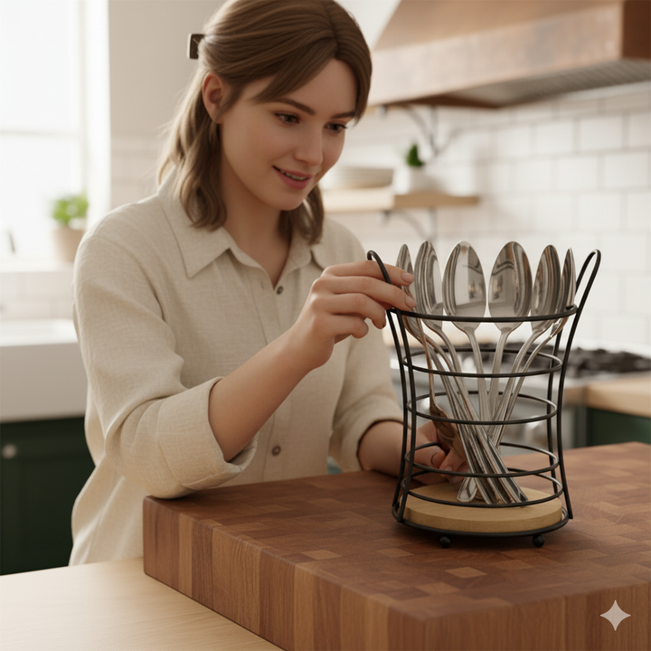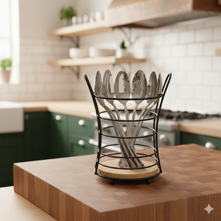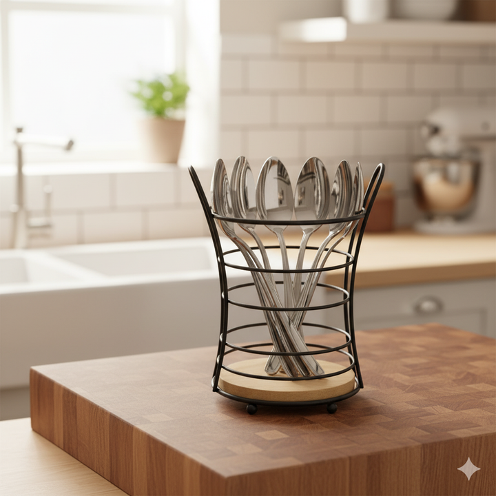 Wood: The base of the holder is a flat, circular piece of light-colored wood, which adds a warm, natural contrast to the black metal frame. This wooden base provides stability and a solid surface for the utensils to rest on.