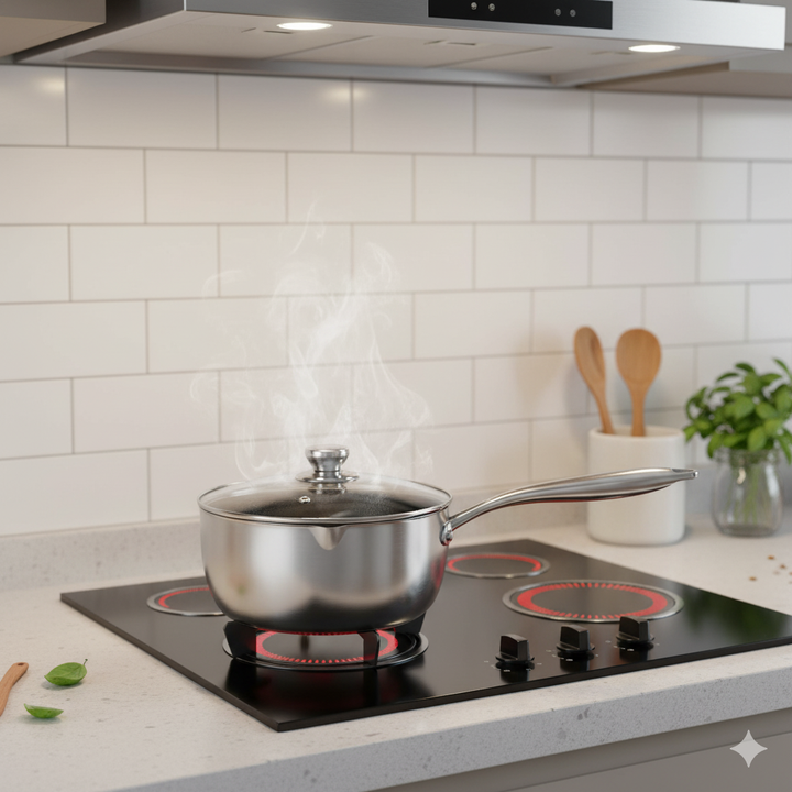 The primary material for the pot body, the handle, and the lid's knob and rim is almost certainly stainless steel. Stainless steel is a very common and durable material for this type of cookware due to its resistance to rust and corrosion, its ease of cleaning, and its ability to withstand high cooking temperatures. The lid's clear section is made of tempered glass.