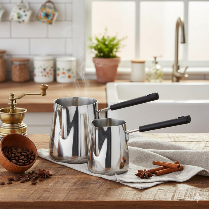 A notable feature is the pouring spout (often square or triangular in shape as seen here). This design allows for precise, drip-free pouring, which is especially important when making Turkish coffee to avoid disturbing the foam (kaymak) or when heating liquids like milk or sauces to pour into small cups or molds. The stainless steel construction also provides durability and even heat distribution.