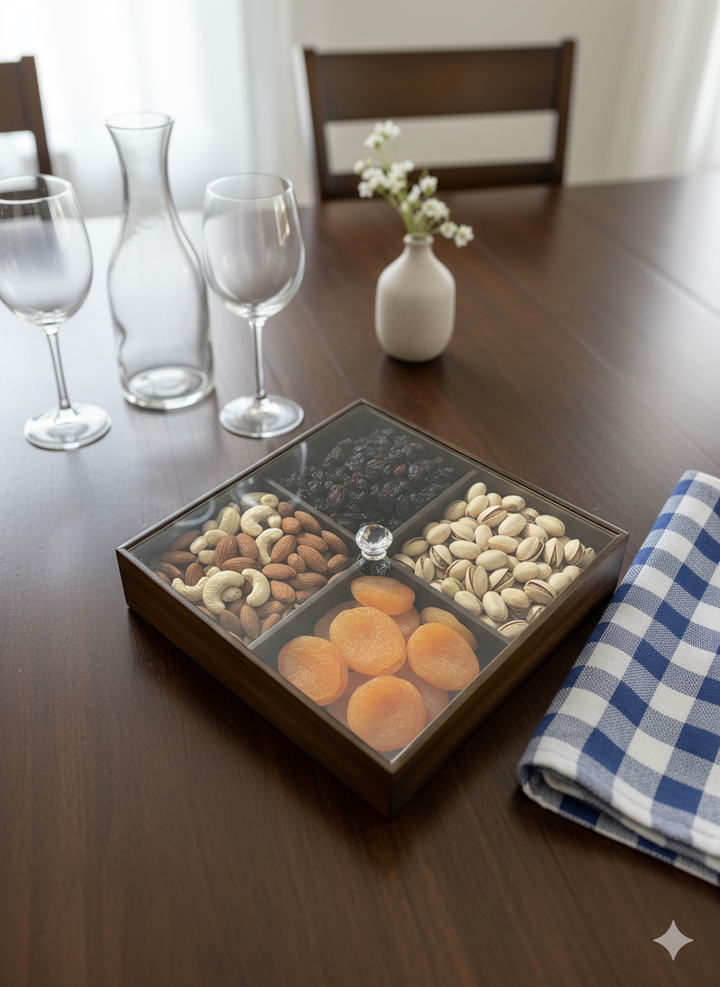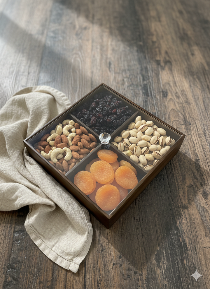 Serving/Gifting: It is frequently used for presentation when entertaining guests, allowing them to choose from a selection of snacks. In South Asian cultures, these boxes are also very popular items for gifting during festivals, holidays, or special occasions, often presented filled with various dry fruits.