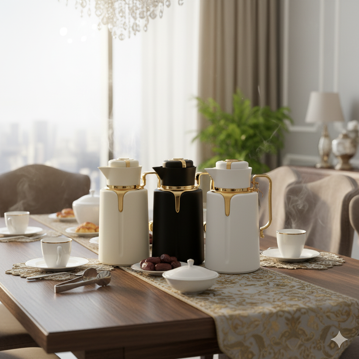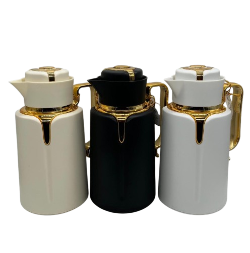 This striking set features three vacuum flasks or thermal carafes, designed to serve hot or cold beverages with style. The sleek, modern design is characterized by a smooth body available in three classic colors: off-white/cream, matte black, and pure white. Each carafe is dramatically accented with gold-tone detailing on the collar, spout, lid, and ergonomic handle, giving them an opulent, distinguished look. They would make a perfect addition to an upscale coffee or tea service.