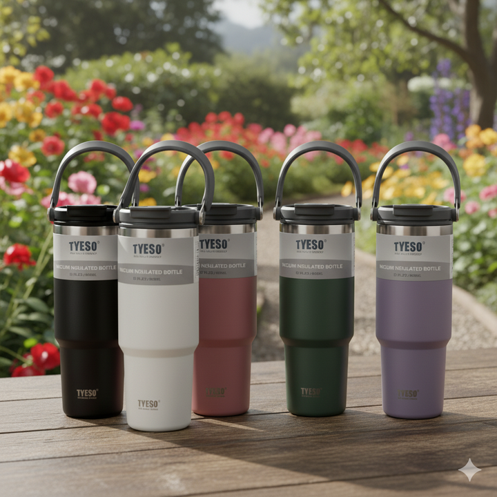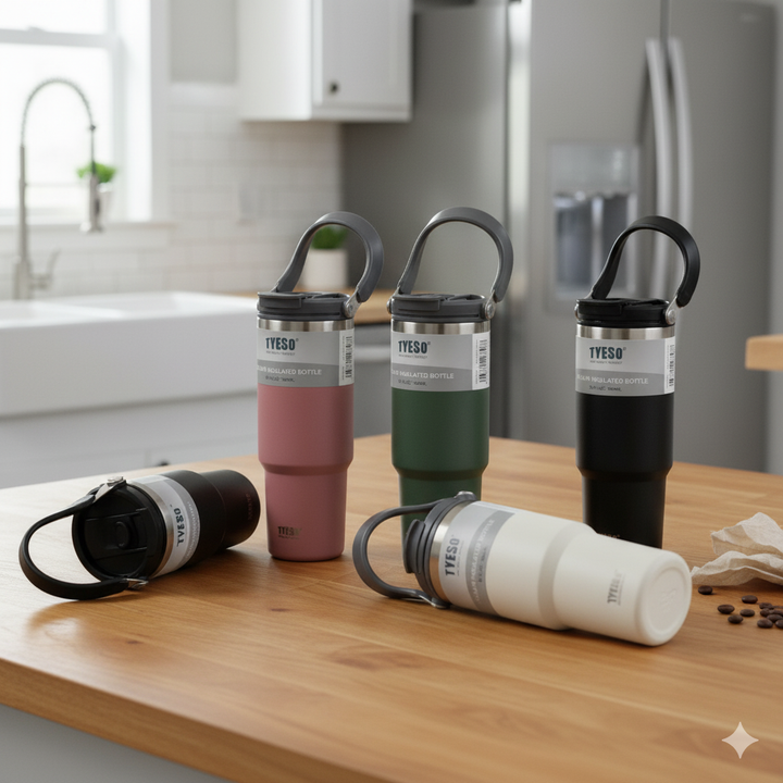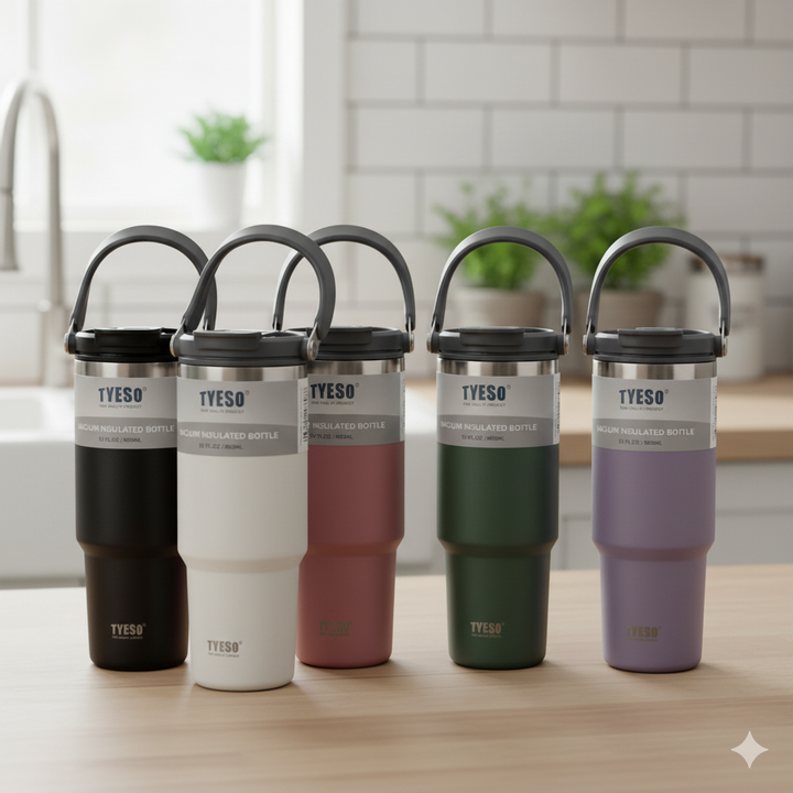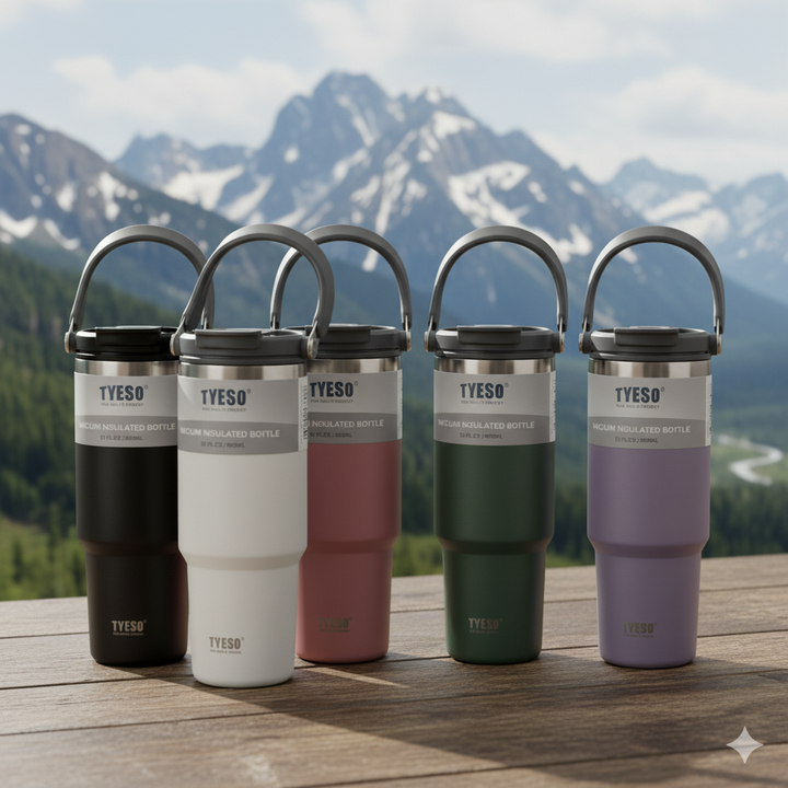 A prominent feature of these TYESO bottles is the sturdy, hinged carrying handle attached to the lid. This feature significantly enhances the portability of the tumbler, allowing users to easily carry it with one finger, clip it to a bag using a carabiner, or simply grab it on the go. This is especially useful for activities like hiking, commuting, or moving around the office or gym, where hands might be full.