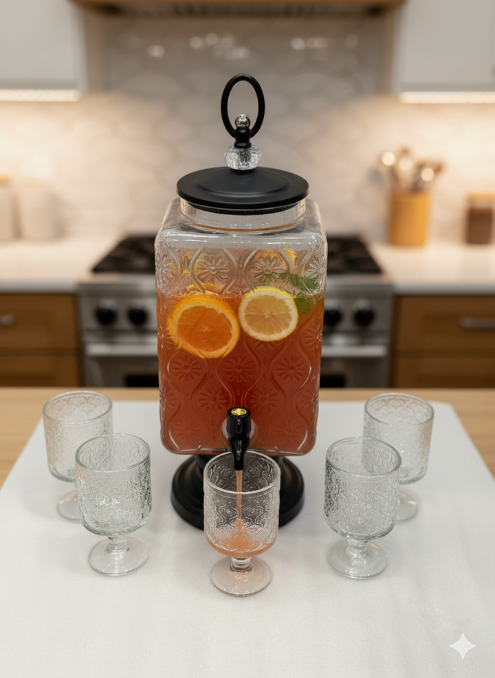 Contrasting Finish: It features black hardware for a modern contrast against the clear glass. This includes a sturdy metal base that elevates the dispenser and allows a glass to fit beneath the spigot.